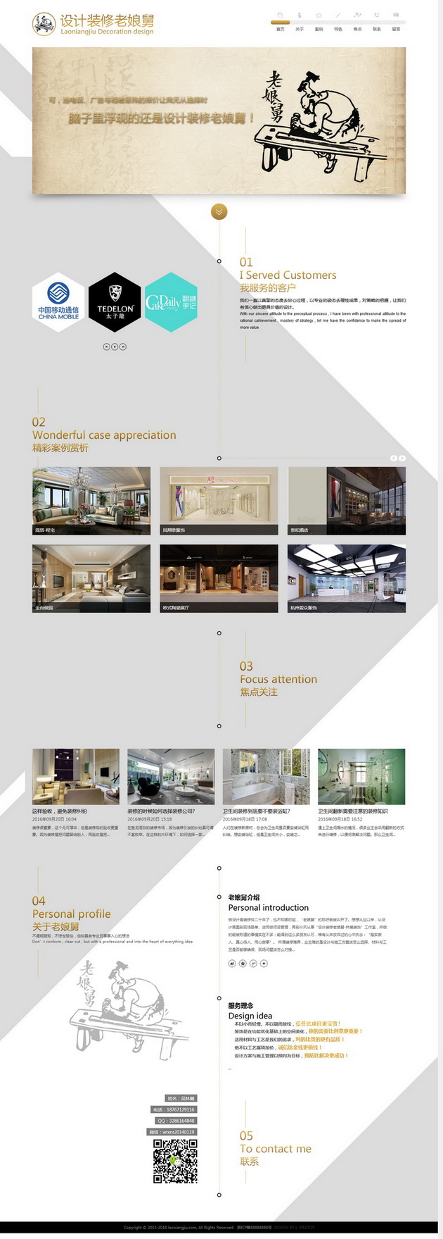 做設(shè)計搞裝修快二十年了,也不知哪時起,“老娘舅”的稱呼就被叫開了。想想從業(yè)以來,從設(shè)計畫圖到現(xiàn)場跟單、進而做項目管理,再到今天從事“設(shè)計裝修老娘舅-林樾裝飾”工作室,所做的能被稱道的事情實在不多;能得到這么多朋友認(rèn)可,唯有從未放棄過的心中執(zhí)念:“踏實做人、真心待人、用心做事”。