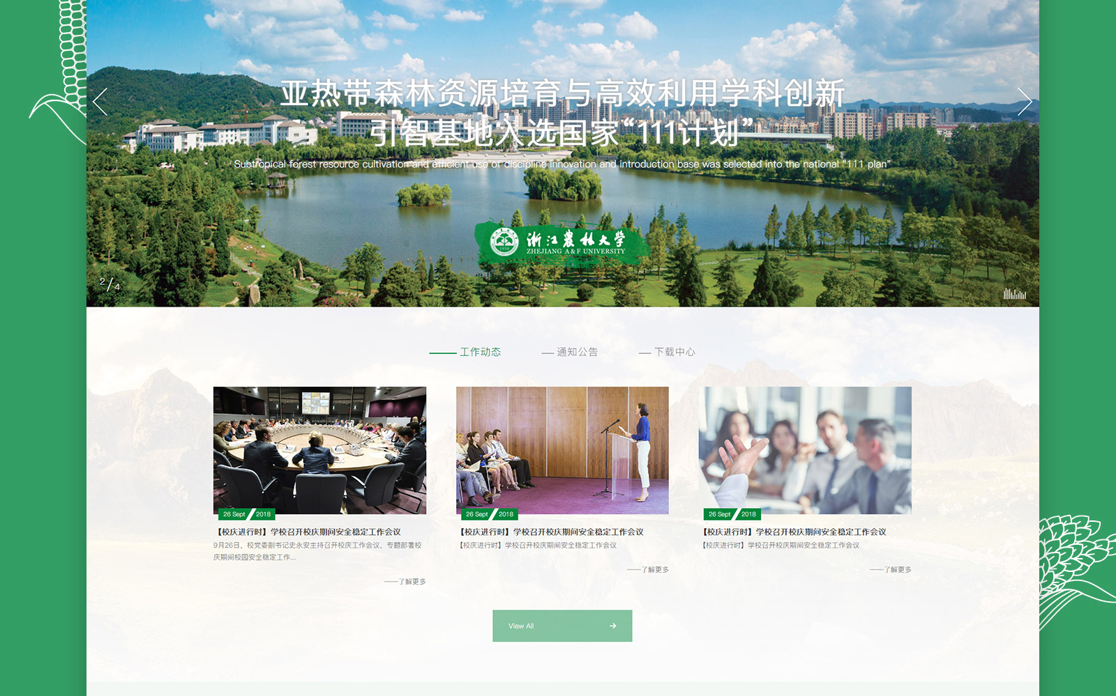 The first-level navigation bar on the homepage is divided into several major columns, which are clear at a glance and convenient for finding information. The combination of the green background image and the white module makes the page look comfortable and grand. In the design of the main page, a large amount of vertical division is employed, with split screens in two or multiple columns. This can conveniently present different information, create contrasts, and at the same time divide effective areas, facilitating users to make quick selections and visual focuses. It greatly reduces the operational difficulty of the website and improves the browsing efficiency of users.