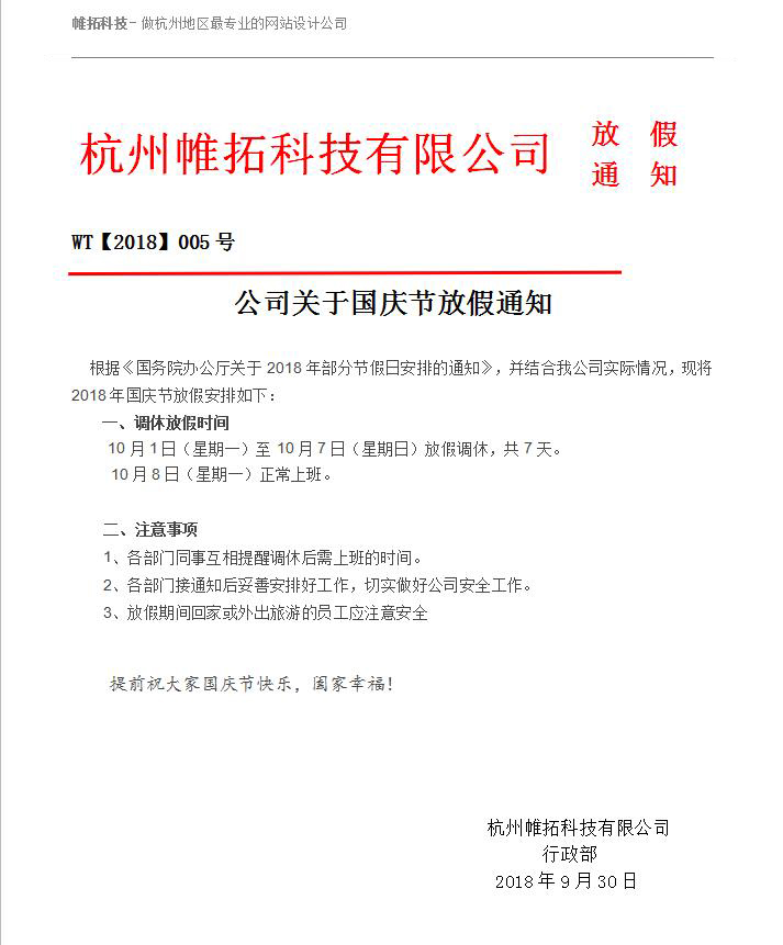 根據(jù)國務(wù)院辦公廳通知精神,現(xiàn)將帷拓科技2018年國慶放假及有關(guān)事項(xiàng)通知如下: