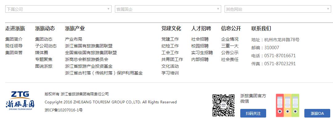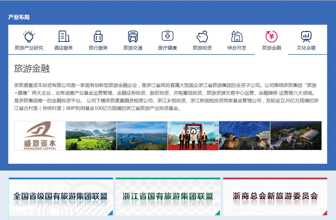 旗下有浙江省現(xiàn)代旅游產(chǎn)業(yè)研究院、浙江外事旅游股份公司、浙旅蝶來酒店集團(tuán)、浙江省中國旅行社集團(tuán)、浙江省醫(yī)療健康集團(tuán)、浙旅投資公司、浙旅湛景置業(yè)公司(旅游小鎮(zhèn)發(fā)展公司)、浙旅盛景資本投資公司(旅游金融公司)等二、三級(jí)企業(yè)77家。