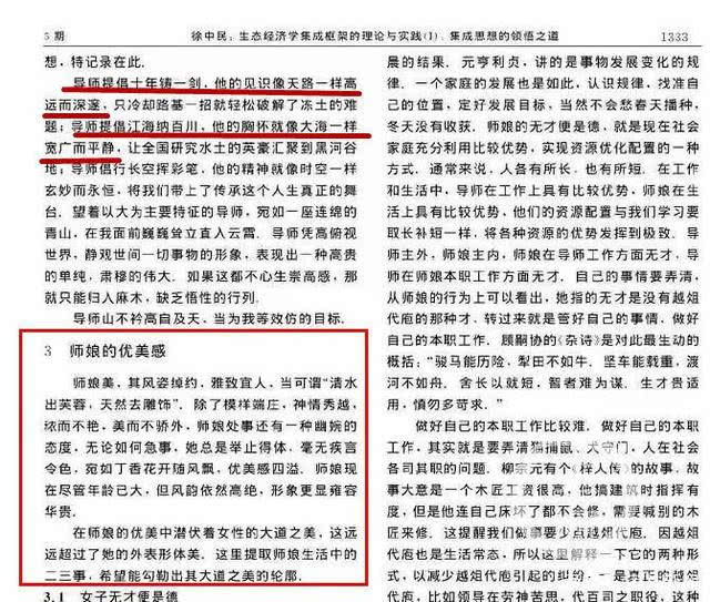 1月12日,主題為《生態(tài)經(jīng)濟學集成框架的理論與實踐》的兩篇論文在社交網(wǎng)站引起了討論,主要是因為其用較大篇幅闡述了“導(dǎo)師崇高感”和“師娘優(yōu)美感”:“我們贊美導(dǎo)師,你是無窮的源泉,讓弟子們思涌吞筆;我們依戀師娘,你有母親的情懷,讓弟子們溪中蕩漾?!?/p>